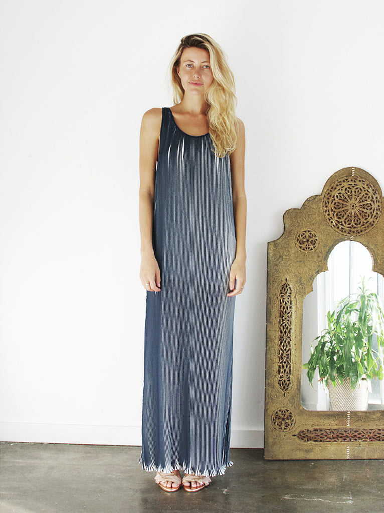 This is a pleated maxi dress with a low back, scoop front neck, and side button plackets to allow for a side slit or open sides completely to wear as a top over pants. Made with an interior mini lining.