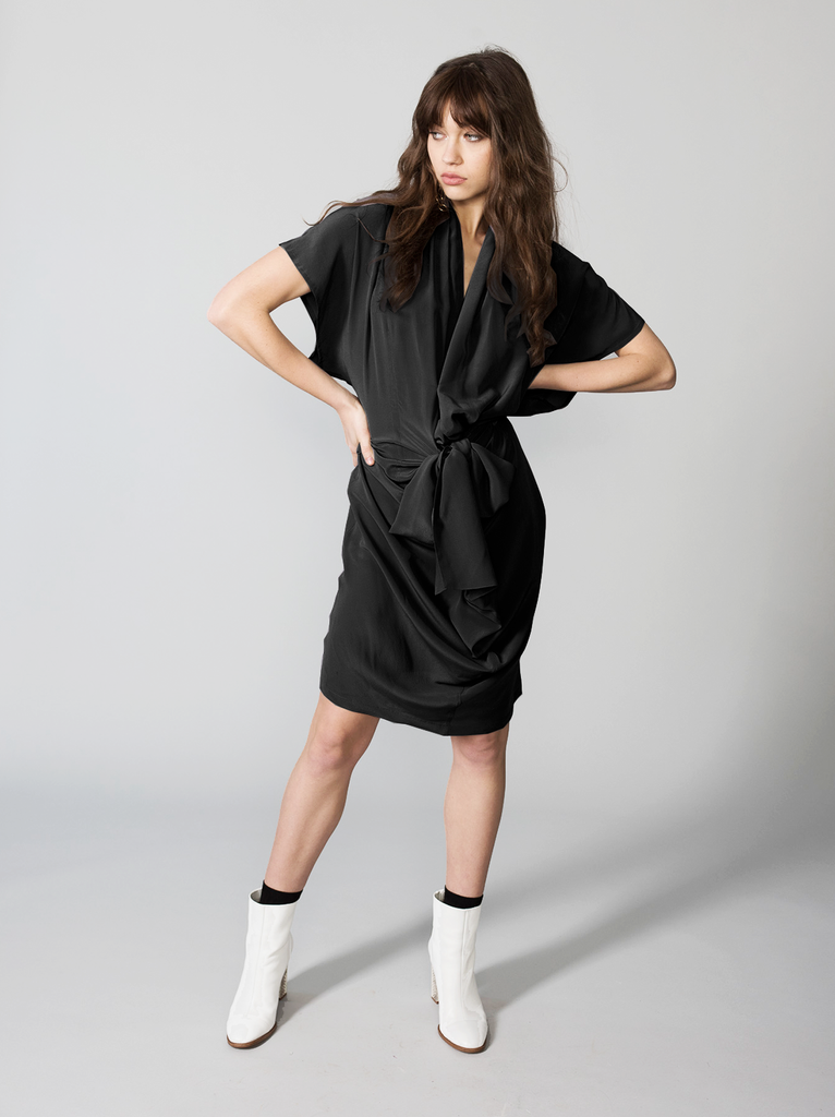 Make a quiet, yet bold statement with this kimono dress. This dress is tailored to drape in all the right places and features a twist front tie detail with excess fabric that is meant to add to the drape.