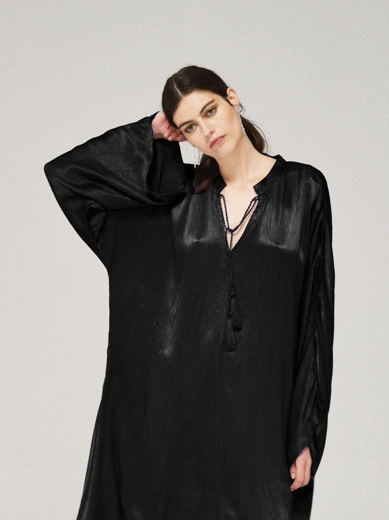 Fall in love with our oversized silky kaftan featuring wide statement sleeves, front tassel tie detail, and a v-neck.