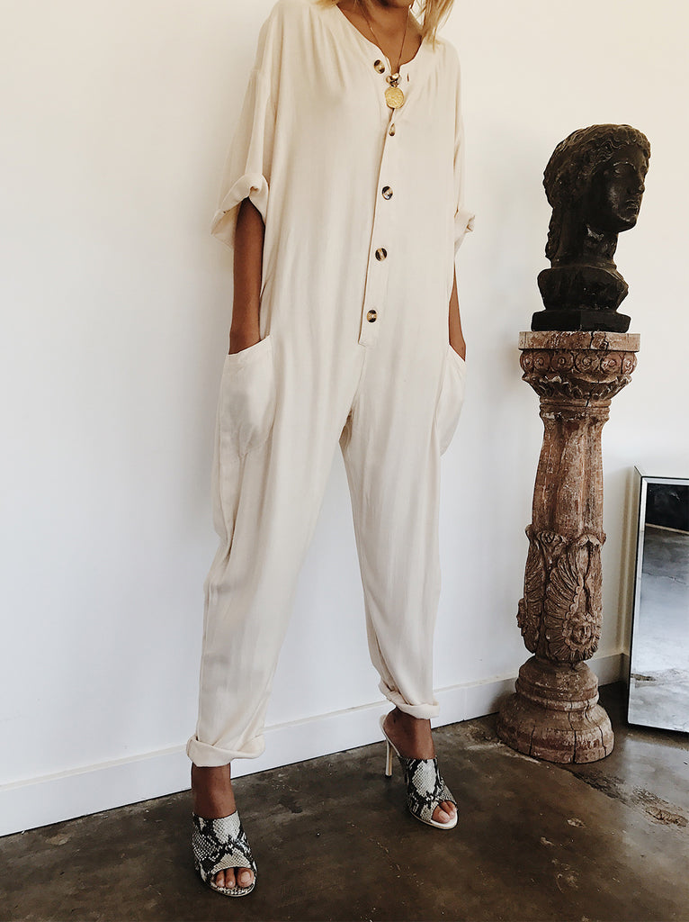 We're all for easy, all-in-one outfits that make dressing in the morning simple and easy. Continuing our signature soft viscose twill fabric, the Avalon Boiler Suit is something you will find yourself living in! Finished with large tortoise shell buttons and pockets, this is not your typical structured piece, but one that's cool, comfy, forgiving, and goes with just about any shoe.
